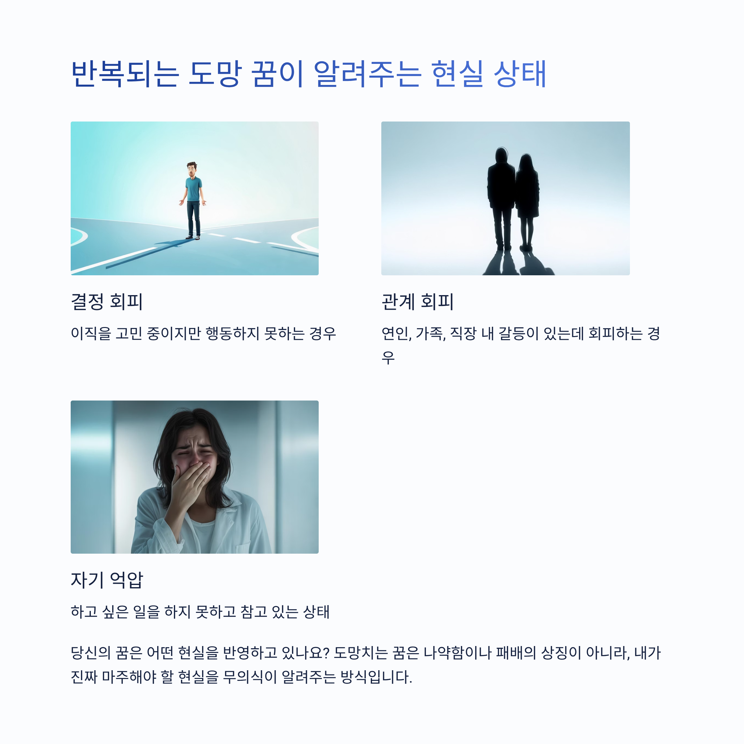 반복되는 도망 꿈은 이런 현실 상태를 반영할 수 있어요.