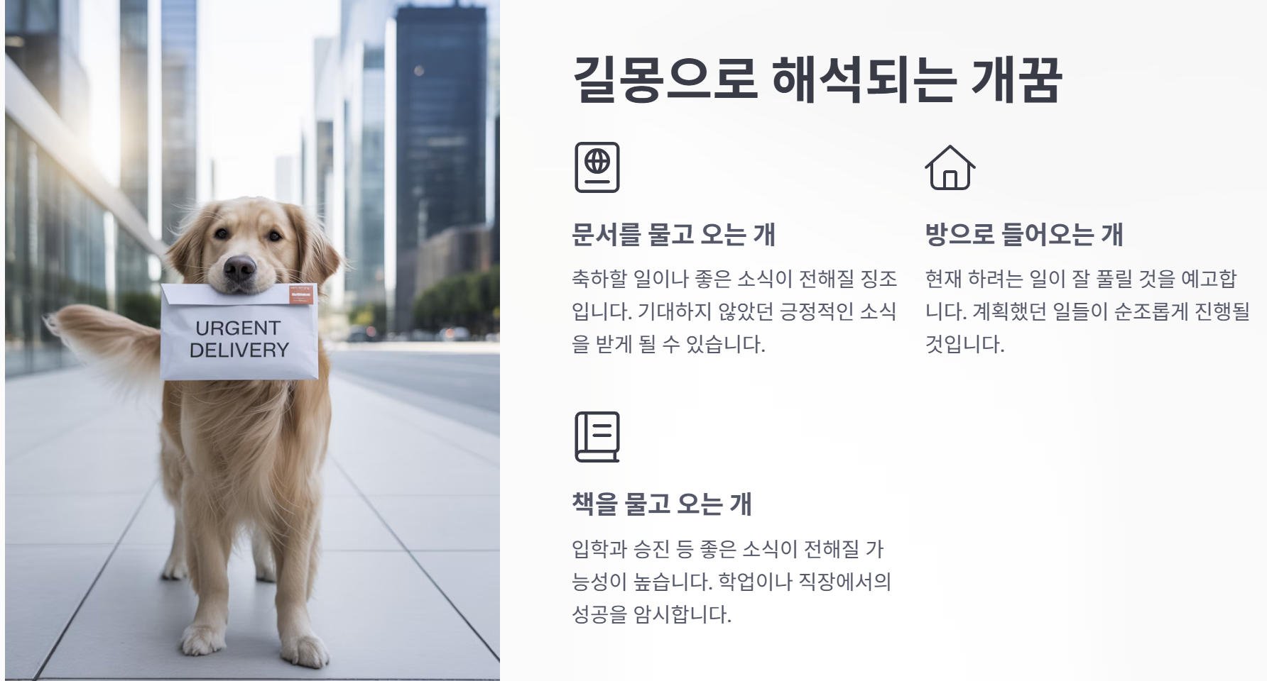 개꿈 중에는 긍정적인 의미를 가진 길몽도 존재합니다. 특히, 개가 문서를 물고 들어오는 꿈은 축하할 일이나 좋은 소식이 전해질 징조로 해석됩니다. 또한, 개가 방으로 들어오는 꿈은 현재 하려는 일이 잘 풀릴 것을 예고합니다. 다음은 길몽으로 해석되는 몇 가지 꿈의 예시입니다: