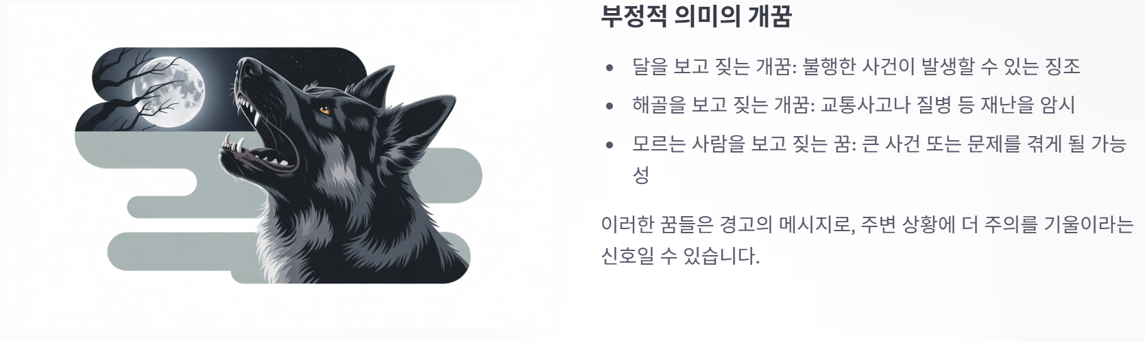 - 달을 보고 짖는 개꿈: 불행한 사건이 발생할 수 있는 징조.
