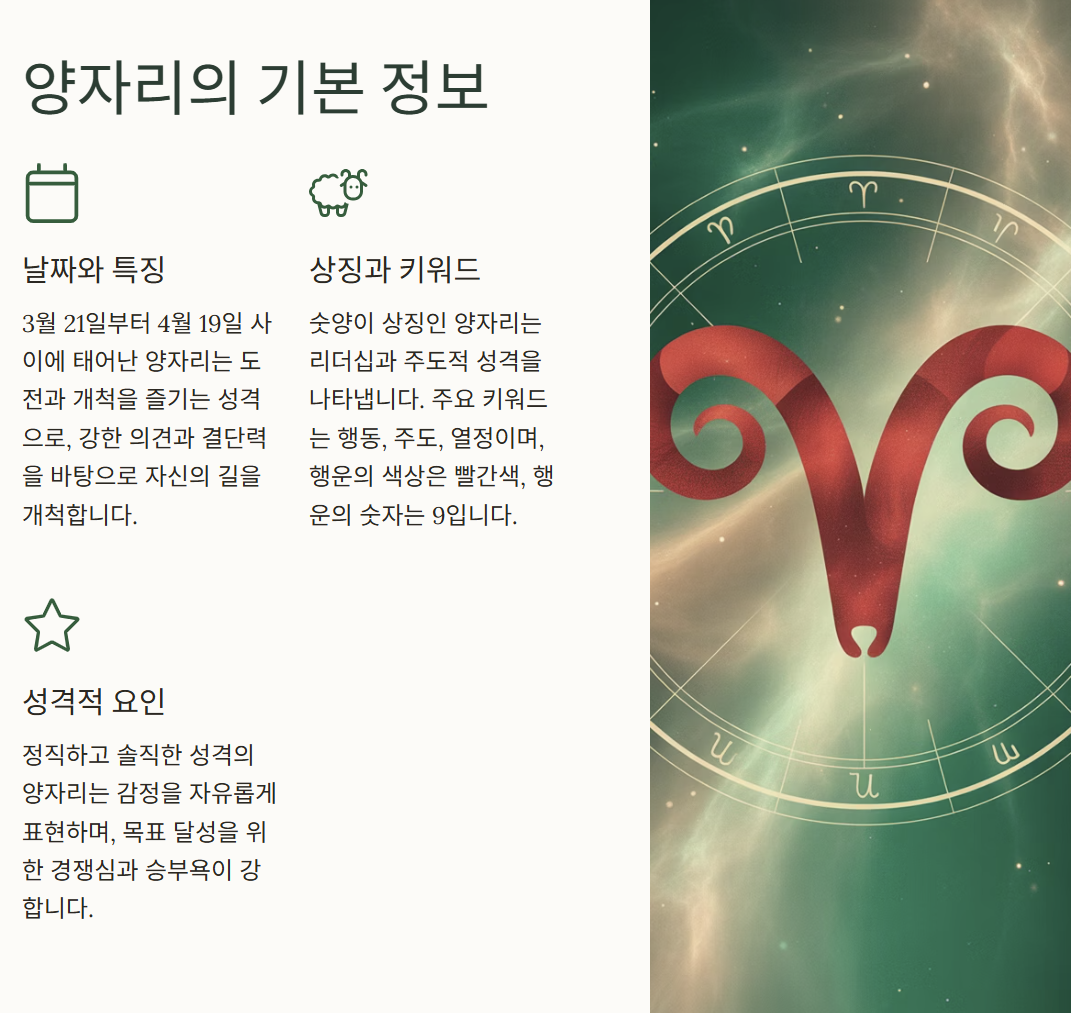 양자리는 3월 21일부터 4월 19일 사이에 태어난 사람들을 아우르며, 불의 원소와 화성의 지배를 받습니다. 이들은 새로운 시작을 두려워하지 않고, 도전과 개척을 즐기는 성격을 가지고 있습니다. 또한, 자신만의 강한 의견과 결단력을 바탕으로 스스로의 길을 개척해 나가는 모습이 보입니다.