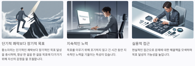 황소자리는 그들의 선택이 가져올 결과를 깊이 고려하며, 이를 통해 그들은 인생에서의 장애물을 극복하는 데 있어 더욱더 확고한 자세를 유지할 수 있습니다. 이러한 특징은 그들을 신뢰할 수 있는 친구이자 파트너로 만들어 줍니다.